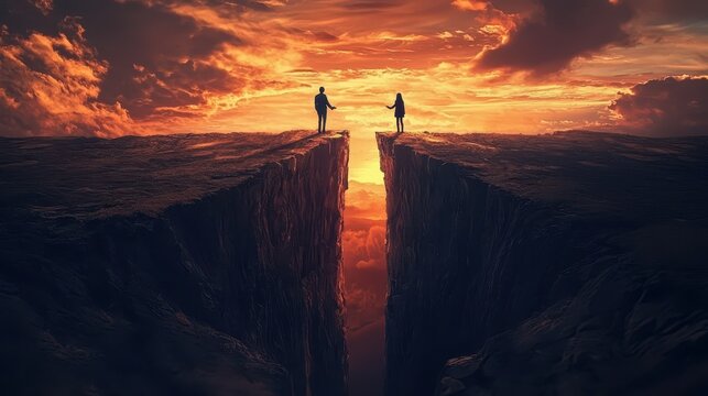 A dramatic scene of two people standing on opposite sides of a canyon, reaching out to each other, symbolizing connection, overcoming challenges, and unity. Ideal for themes of teamwork