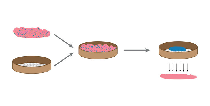 Separation mixtures with sifting diagram. Sieving filtration process. Mixture of sand and gravel. Scientific resources for teachers and students.