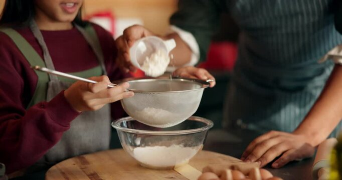 Dad, girl and hands with sifting for flour with cooking, teaching and ingredients for cookies in home. African people, father and daughter in kitchen, learning and sieve for baking with family