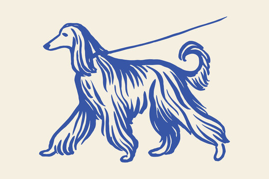 Afghan hound dog on leash hand drawn sketch vector illustration