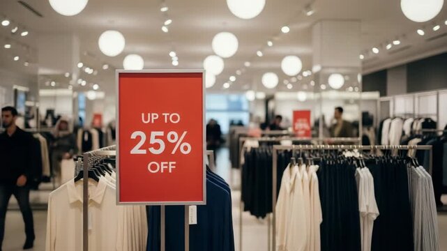 Up to 25 off sale sign in clothing store with garments and shoppers