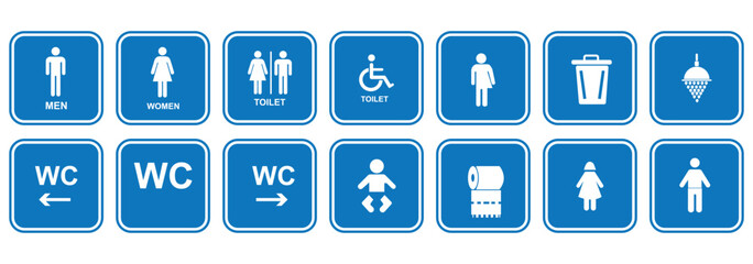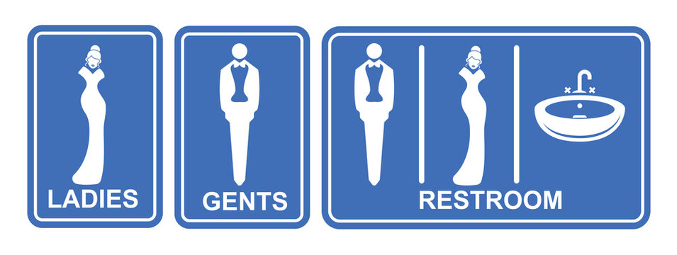 Restroom sign icon clipart set. Ladies and gentlemen toilet signages clip art in blue signboard collection for public and private pictogram vector illustration.