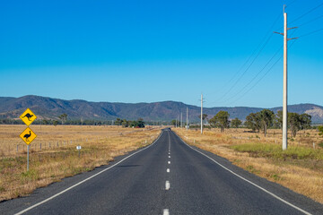 Close up photo of a road and bush land with yellow signages