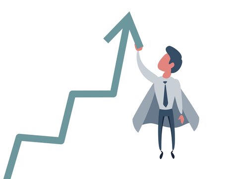 Business concept of a superhero businessman taking the graphic chart high up. Vector illustration, flat design, cartoon style, isolated background.