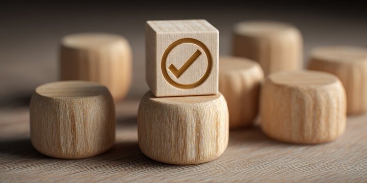 Success Symbol: A wooden cube with a checkmark on top of other wooden blocks, set against a blurred background, which signifies approval and achieving a target.