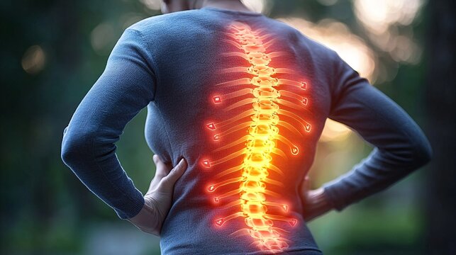 A stylized figure holding their back, with red arrows pointing to the lumbar region to signify pain.