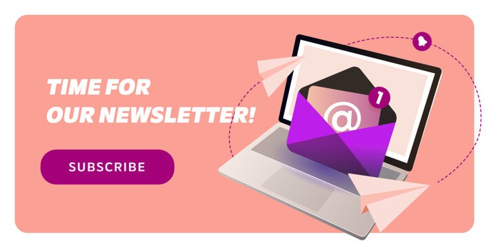 Newsletter subscription banner. Vector illustration for online marketing and business. Open laptop with envelope and flying paper plane. Template for mailing and newsletter.