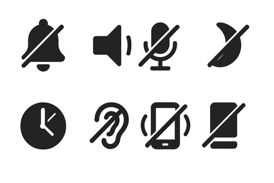 Silent Mode Icons. Solid, filled icon set of silence signs and notifications: muted bell, crossed speaker, no microphone, silent mode, do not disturb, quiet