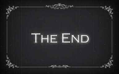 Silent cinema film end, movie screen with retro ornamental border frame. Vector vintage conclusion of the Hollywood cinematography narrative, white glow words the end on black background in noir style