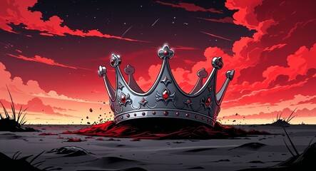 Fallen crown resting silently on black sand under a blood red sky anime cartoon illustration design