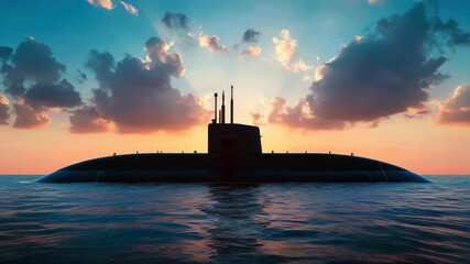 Submarine Silhouetted Against a Sunset Sky: A formidable submarine glides silently across the calm sea at sunset, its silhouette contrasting against the fiery hues of the sky.