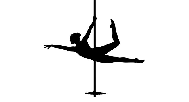 Dynamic pole dancer silhouette performing a stunning acrobatic move, showcasing fitness, flexibility, and strength in a minimalist black and white design
