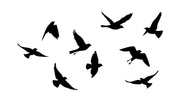 Black vector flying birds flock silhouettes isolated on white background