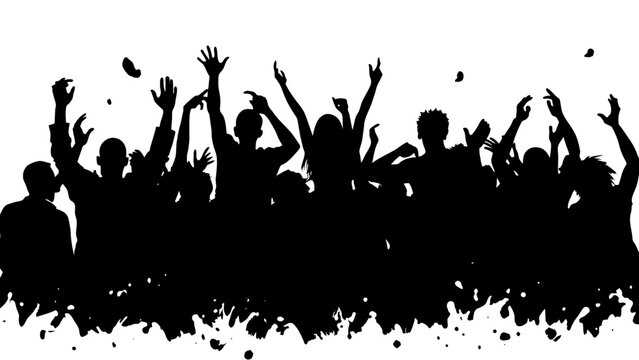 Excited crowd silhouette with arms raised in victory or celebration. Depicts energy, cheering, concert audience, political rally, or success. Ideal for concepts of community, triumph, sports, and live