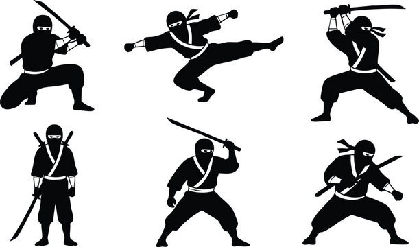 Ninja silhouettes in action poses with swords and martial arts dynamic movements vector illustration