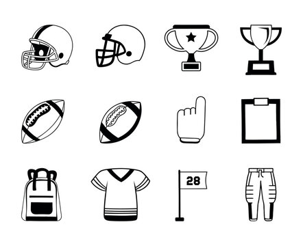 American football equipment line art isolated vector set, football sports silhouette game jersey and helmet goal, shoe boot, USA ball with other elements with white background