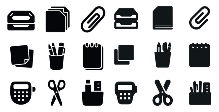 Office supplies solid icons set – stationery, silhouette, business tools collection