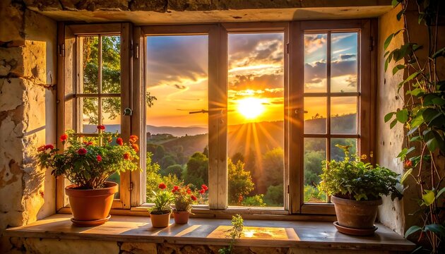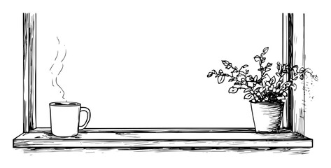 hand-drawn vector illustration of coffee cup and potted plant on window sill