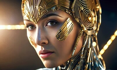 A sleek and elegant female cybernetic face intricate gold and silver plating. design features glowing energy lines mimic facial expressions