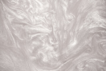 Shimmering silver abstract background. Liquid glitter paint texture waves and swirls. Beautiful shiny white glitter texture. Metallic silver paint close-up as a holiday background.