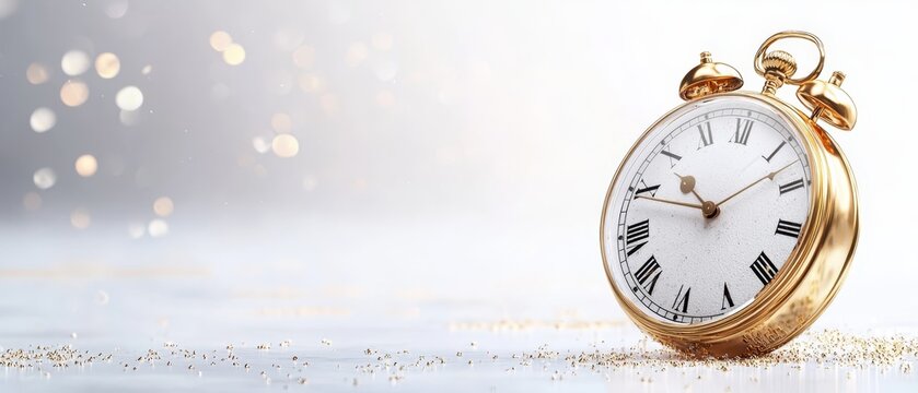 A tight shot of a golden pocket watch against a backdrop of gold and silver, with a halo of soft light in the background