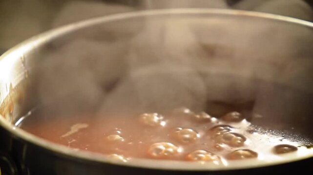 Steaming pot of savory soup simmering on the stove, with soft focus kitchen background