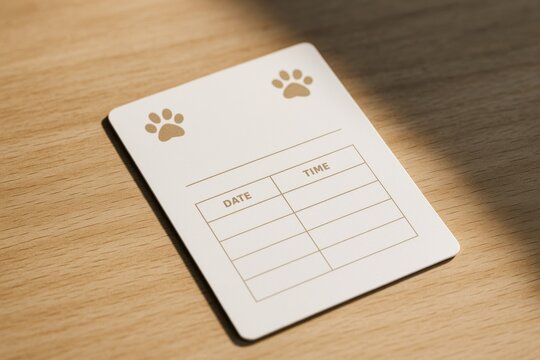Minimal pet appointment card with paw icons and date-time chart on wooden background in natural light, creative and clean layout design. Ai generative