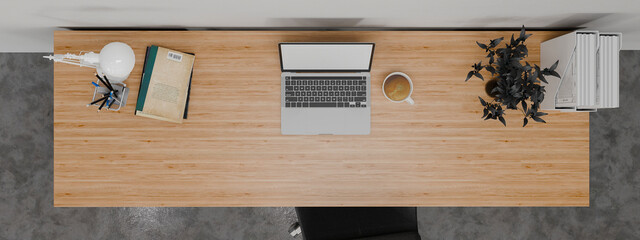 3D render Wide Top view table - Creative flat lay wood office desk.