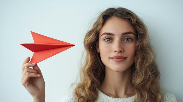 A woman holds a red paper plane against a white background. The simplicity of the plane contrasts with her thoughtful expression, evoking a sense of creativity and optimism.