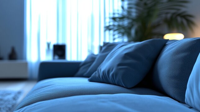 Modern living room with a blue sofa, embodying simplicity and contemporary design.