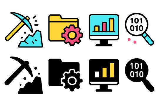 Modern vector illustrations of data mining concepts with tools, charts, and folders on a clean background showcasing technology and analytics