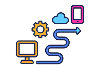 Digital technology process with computer, smartphone, and cloud icons digital transformation path