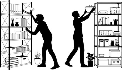 People Organizing Shelves: Silhouettes of Men Arranging Office or Home Storage