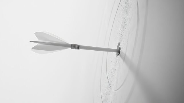 A white dart aimed directly at the target on a plain white background, highlighting simplicity and focus with a monochromatic theme.
