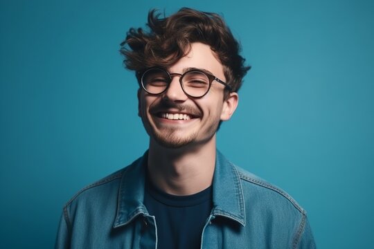 Cheerful curly haired woman keeps hands under chin has closed eyes smiles broadly expresses sincere positive emotions and feelings dressed casually isolated over blue background. Happiness concept