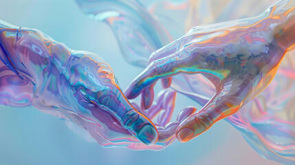 A video clip with a close-up of two hands touching against a background of holographic glass sculptures surrounded by a pale blue shade of resin conveys a moment of emotional connection and intimacy.