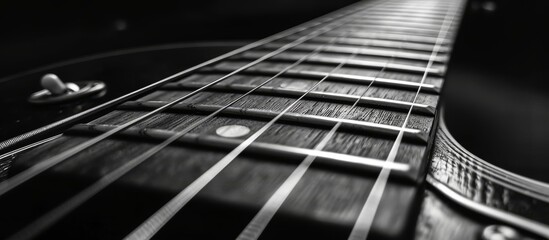 It is a black and white photo of a guitar, a string instrument made of wood. It showcases a guitar accessory.