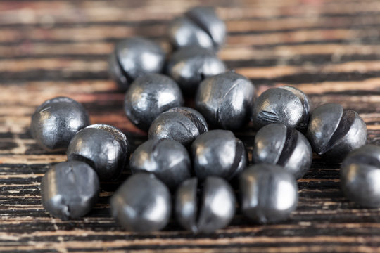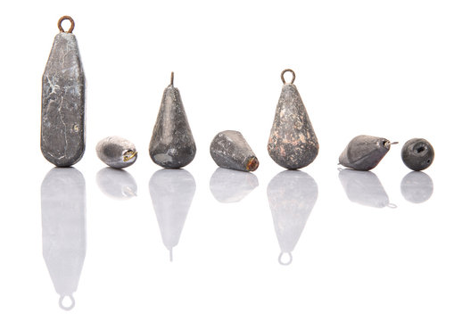 Lead fishing weights cast sinkers isolated on white background. Equipment or tools. Heap of lead sinker weights for fishing, silver bullet bank accessories, close up