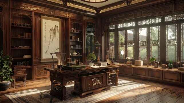 Elegant Traditional Chinese Study Room with Symmetrical Design and Natural Light Featuring Comfortable Seating and Artistic Decor
