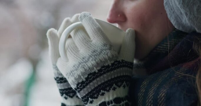 A person wearing a cozy sweater while sipping a warm drink on a chilly winter morning.