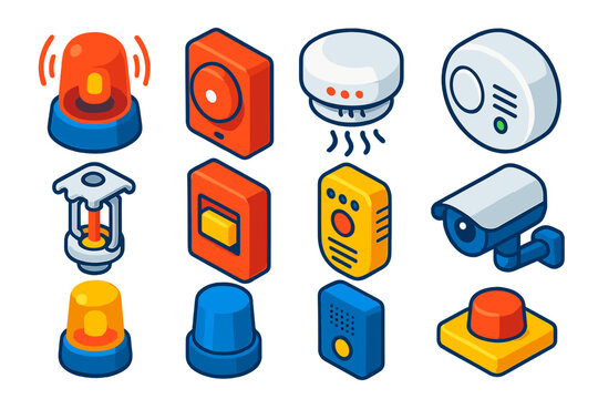 Safety Warning Icons. Isometric vector illustration set Safety and Warning: emergency siren, wall-mounted alarm, smoke detector,