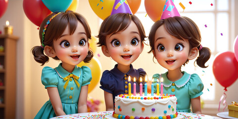Beautiful Birthday illustration with three smiling kids and a birthday cake with candles. Generative AI