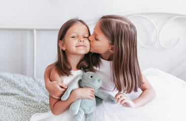 A little girl kisses her little sister on the cheek. Girls resting in the children's bedroom