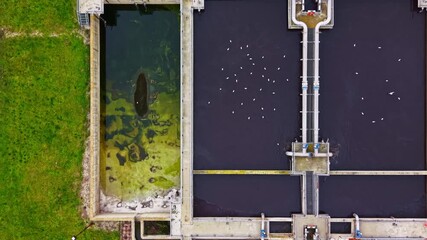 From above, two sections of a water treatment plant are visible, one with clear water and the other with dark water. Birds are seen flying in the area during the day.