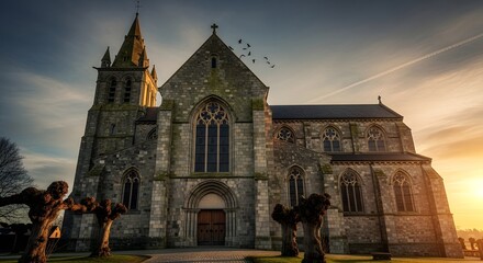 Flock of Birds in Silhouette Against Colorful Sunset Sky