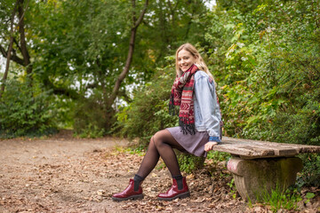 Attractive woman sitting on bench in autumnal park