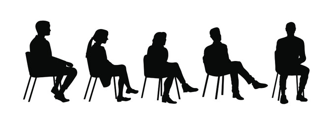 Silhouette of seated people, male and female sitting poses, side and front view, vector illustration, modern design, human figure collection