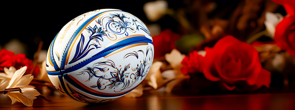Lone rugby ball on vibrant green field with stadium backdrop, sports significance