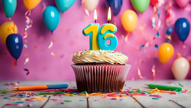 Birthday cupcake with burning lit candle with number 16. Number sixteen for sixteen years or sixteenth anniversary.
