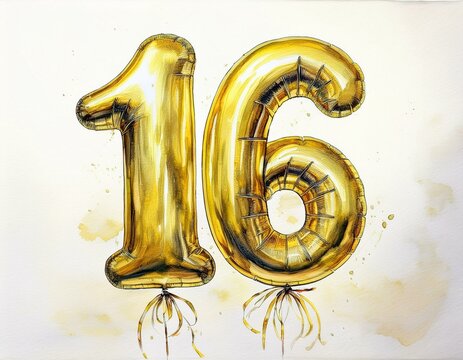 Yellow birthday / anniversary balloon, number 16, watercolor painting with white background